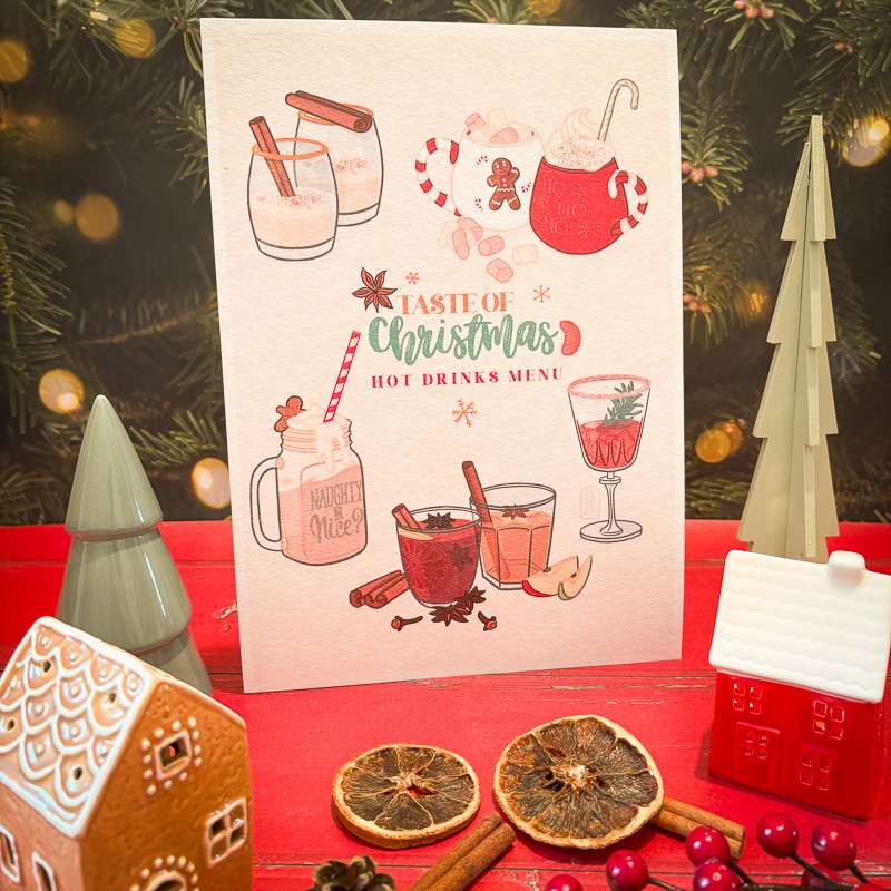 Dans Boissons de Noël, ce sont les breuvages de saison qui prennent la pose : latte mousseux, chocolat bien crémeux, vin chaud fumant… Chaque boisson est accompagnée de ses petits détails savoureux : toppings, épices, tranches d’orange ou biscuits à tremper. Un format réconfortant, à afficher près de ta bouilloire ou dans un coin lecture bien douillet ✨.