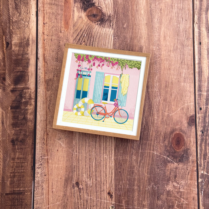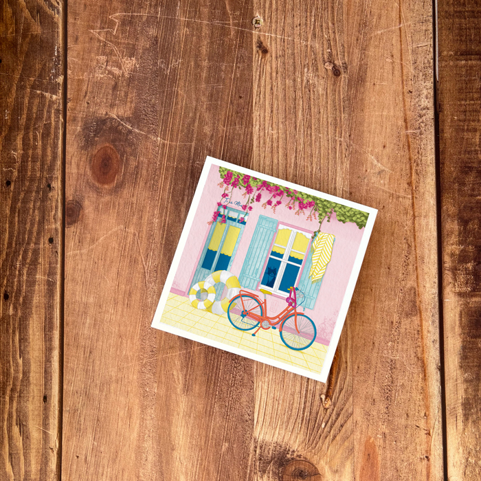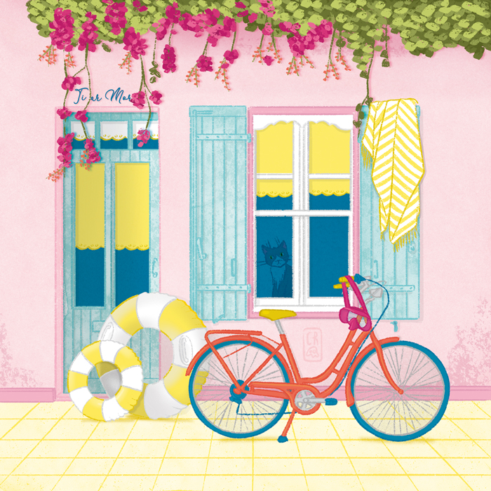 Voici une façade comme on en rêve tout l’hiver 🌸 : une maison rose poudré aux volets bleu lagon, une bougainvillée qui déborde généreusement sur la rue, une serviette rayée qui sèche au soleil. Le vélo rouge est déjà là, la bouée gonflable aussi — il ne manque plus que toi. Et derrière la vitre, un chat surveille les préparatifs avec son détachement habituel.