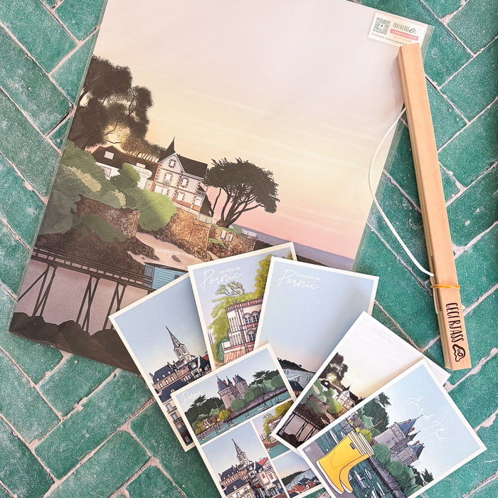 Lot Pays de Retz — 35€ — Pornic dans la poche Tout ce qu’il faut pour garder Pornic près de soi : collection complète de cartes postales, affiche 30×40 au choix et support bois.