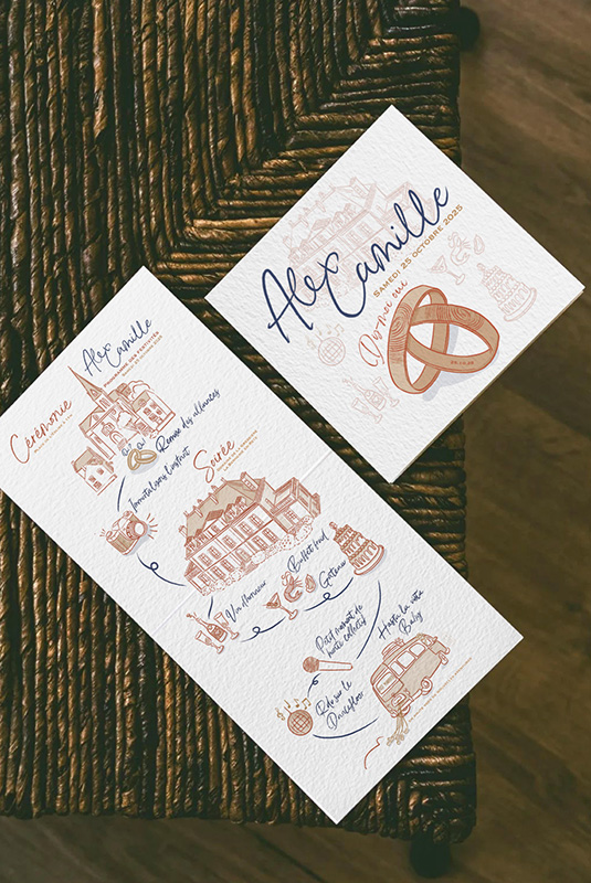 Pour ce faire-part de mariage, je me suis inspirée de deux lieux : le magnifique Domaine de la Gressiere à la Bernerie-en-Retz et la jolie ville de Belle-île-en-mer.