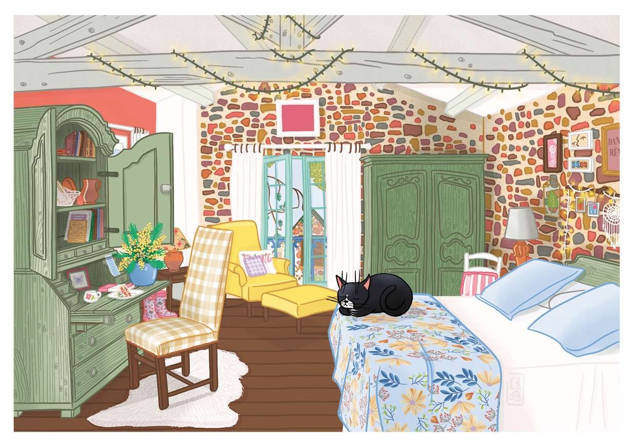 Au cœur d’une chambre baignée de lumière, un petit chat s’est installé sur un lit fleuri, maître des lieux et des siestes prolongées. Les pierres anciennes murmurent le charme discret des demeures anglaises, tandis que le secrétaire, entre livres et tasses de thé, semble avoir appartenu à une autrice ou une rêveuse.