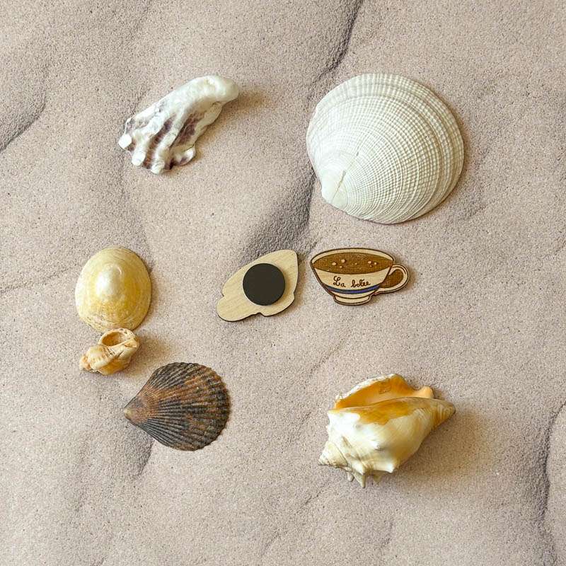 Petits goodies en bois à croquer (avec les yeux, hein), illustrés avec amour et humour, fabriqués en local, (parce que le local, c’est d’la balle) et colorés à la main par mes soins avec des crayons spéciaux (pas ceux que tu mâchouillais à l’école), ils existent en version broche, pins ou magnet. À collectionner ou à offrir aux fans de café, chats, goûters ou tout ça à la fois. Retrouve toute la collection de goodies en bois ici.
