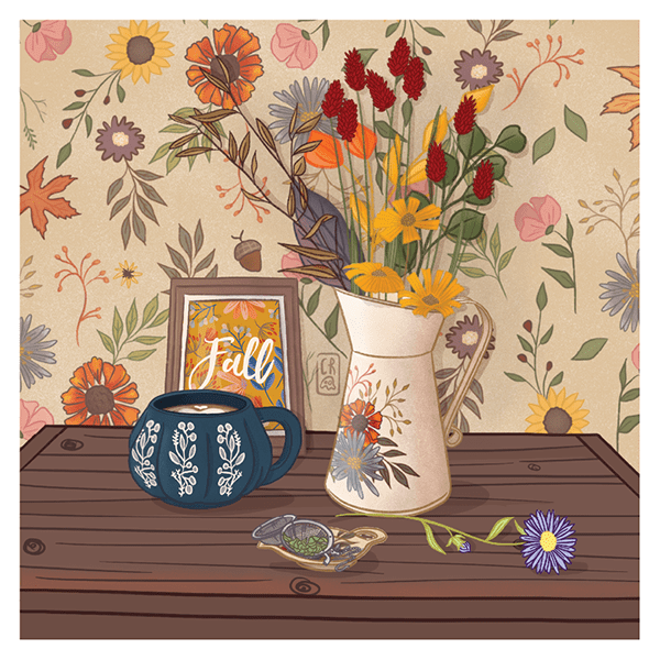 Les fleurs seraient périssables…Dans cette illustration, les fleurs sont partout ! Du mur à la cruche, un vrai pot pourri. Offrez-vous ces jolies fleurs d’automne sans avoir ni à les couper, ni à les arroser. A vous la main verte !