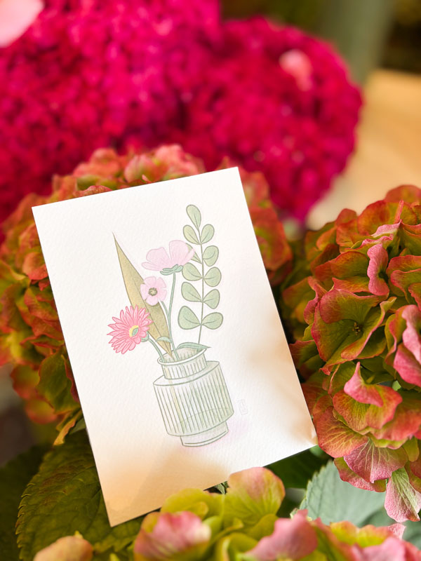 À partir de la carte illustrée, Lydia a imaginé une nouvelle composition en y ajoutant des fleurs séchées. Le dessin devient point de départ, et son savoir-faire s’exprime jusqu’au bout, entre image et matière.