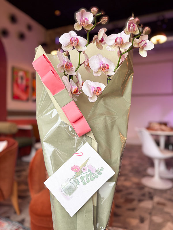 À partir de son savoir-faire, Lydia (Agapanthe) a imaginé une composition exclusive : choix des fleurs, du vase, de l’intention. J’ai traduit ce bouquet en illustration, pensée comme un nouveau produit à proposer en boutique.